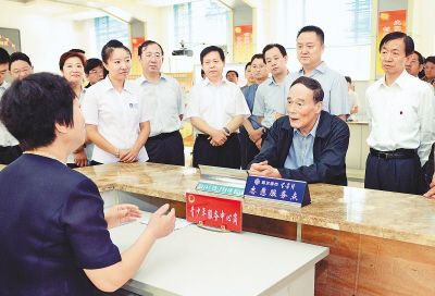 王岐山在哈爾濱市撫順社區(qū)辦事大廳調(diào)研。  新華社記者攝