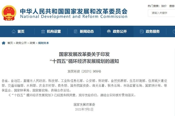 近日,經(jīng)國務(wù)院同意,國家發(fā)展改革委印發(fā)了《“十四五”循環(huán)經(jīng)濟發(fā)展規(guī)劃》(發(fā)改環(huán)資﹝2021﹞969號,以下簡稱《規(guī)劃》),全面部署了今后一段時期我國循環(huán)經(jīng)濟發(fā)展的總體思路、主要任務(wù)、重點工程行動和保障措施,指明了“十四五”循環(huán)經(jīng)濟發(fā)展路徑,對于推進循環(huán)經(jīng)濟發(fā)展,構(gòu)建綠色低碳循環(huán)的經(jīng)濟體系,助力實現(xiàn)碳達峰、碳中和目標(biāo)意義重大。