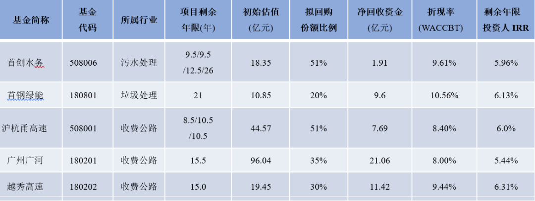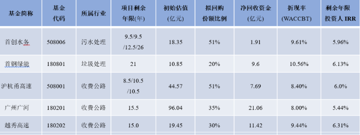 四是回購(gòu)份額比例。公募REITs要求項(xiàng)目公司的全部股權(quán)必須通過(guò)資產(chǎn)證券化(ABS)轉(zhuǎn)移至公募基金,但原始權(quán)益人必須回購(gòu)公募基金一定比例的份額,最低是20%,也可以繼續(xù)并表管理。這五單中,除了首鋼綠能為20%的,其他4單均超過(guò)20%,最高達(dá)到51%。