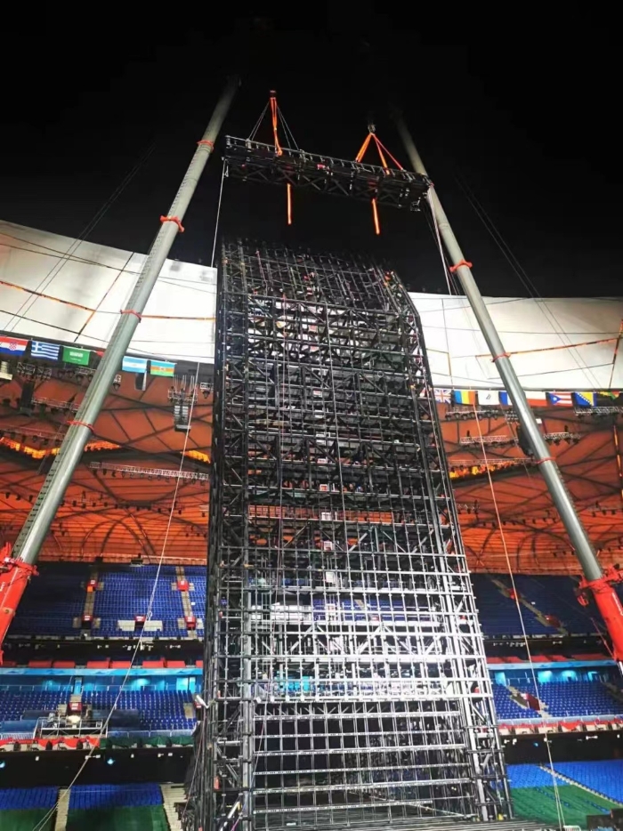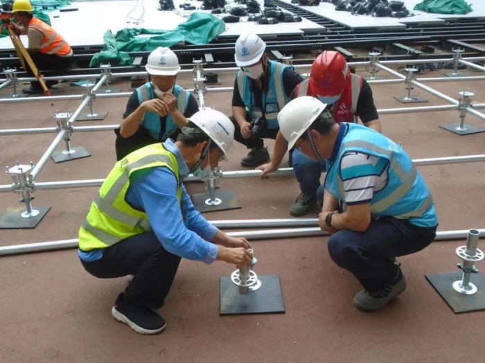 雖然面臨施工環(huán)境復雜,鋼梁、混凝土結(jié)構(gòu)、基礎肥槽、排水溝、攝影溝、看臺板等星羅棋布;工期緊,地面舞臺工程要在9個多月的時間內(nèi)完成10個系統(tǒng)的搭建、安裝和調(diào)試工作;參建單位多,經(jīng)常立體交叉作業(yè)、安全風險大等重重困難,中咨管理團隊逢山開路、遇水架橋,把一切掌握在可控范圍。