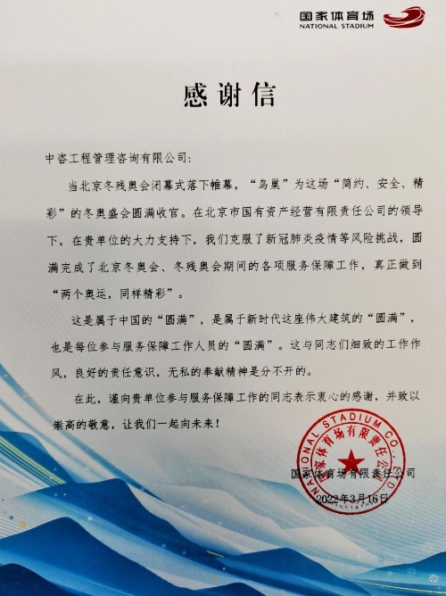 2022年3月,中咨管理公司收到國家體育場發(fā)來的熱情洋溢的感謝信,感謝管理公司給予的大力支持,肯定中咨管理團隊細致的工作作風、良好的責任意識和無私的奉獻精神,盛贊“兩個奧運,同樣精彩”是“屬于中國的‘圓滿’,是屬于新時代這座偉大建筑的‘圓滿’,也是每位參與服務保障工作人員的‘圓滿’”。