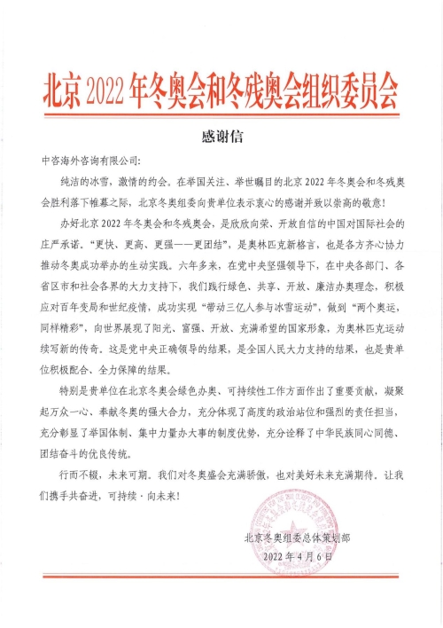 2022年4月6日,一封來自北京冬奧組委的感謝信翩然而至,讓中咨海外公司咨詢團隊難掩激動與興奮。