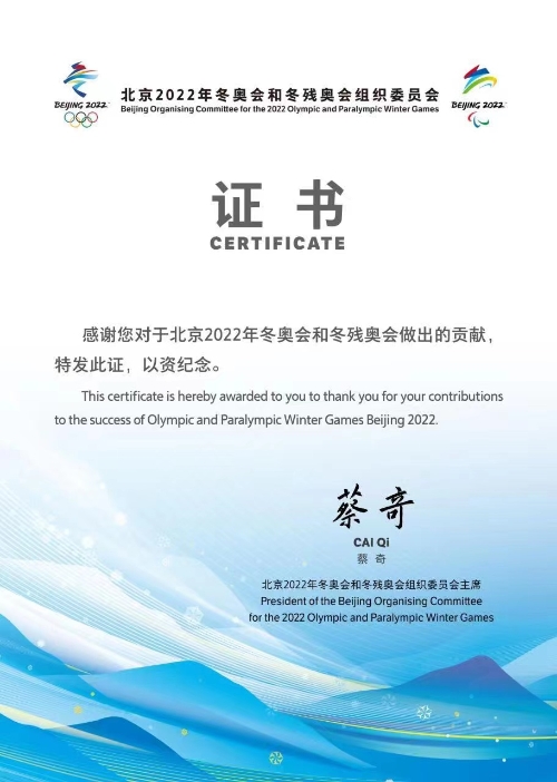 中咨海外公司綜合業(yè)務部副主任張清偉收到的來自北京冬奧組委的證書