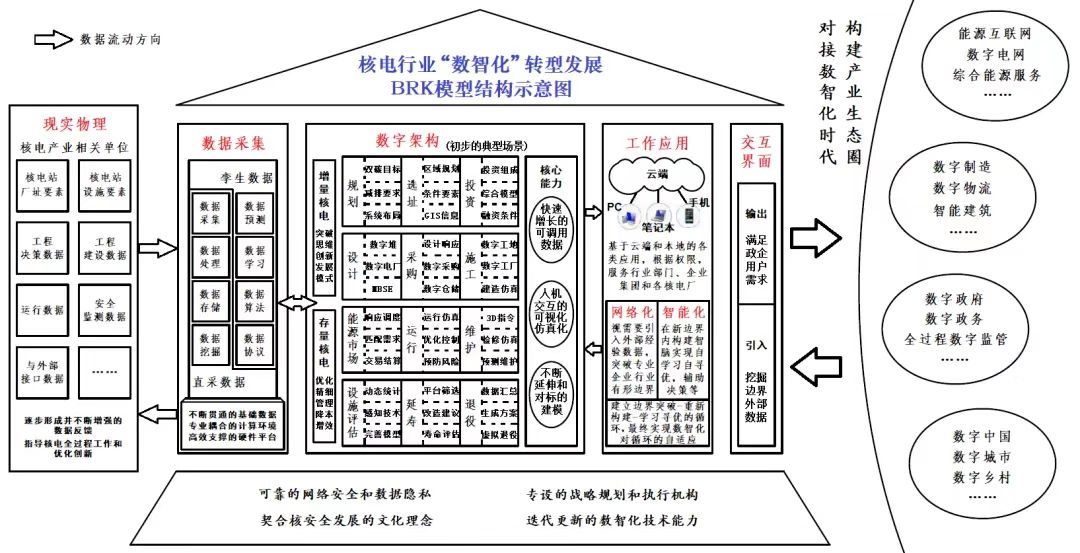 編者按:我國(guó)力爭(zhēng)2030年前實(shí)現(xiàn)碳達(dá)峰、2060年前實(shí)現(xiàn)碳中和,是黨中央經(jīng)過(guò)深思熟慮作出的重大戰(zhàn)略決策,事關(guān)中華民族永續(xù)發(fā)展和構(gòu)建人類(lèi)命運(yùn)共同體。能源領(lǐng)域碳排放總量大、占比高,是實(shí)現(xiàn)綠色低碳轉(zhuǎn)型和高質(zhì)量發(fā)展的關(guān)鍵。公司能源業(yè)務(wù)部成立了以部門(mén)領(lǐng)導(dǎo)為龍頭、以青年黨員為骨干的“3060”研究小組,貫徹新發(fā)展理念和能源安全新戰(zhàn)略,對(duì)以新能源為主體的新型電力系統(tǒng)、碳排放和水電、新能源、核電、儲(chǔ)能、煤炭等方面高質(zhì)量發(fā)展進(jìn)行了探索性研究,以推動(dòng)構(gòu)建清潔低碳安全高效的能源體系。為促進(jìn)研究成果的應(yīng)用,本公眾號(hào)將核心研究成果以系列文章的形式陸續(xù)刊發(fā),供業(yè)界同仁參考。 “兩個(gè)構(gòu)建”背景下核電“數(shù)智化”發(fā)展思路與路徑研究 黃文 丁嵐 柴進(jìn)進(jìn) 摘要:在我國(guó)能源和電力產(chǎn)業(yè),“數(shù)智化”因?qū)δ茉匆嘏渲眯蕛?yōu)化、供需匹配協(xié)調(diào)、綜合能效提升乃至“兩個(gè)構(gòu)建”實(shí)施成效的關(guān)鍵作用,長(zhǎng)期以來(lái)備受各方關(guān)注。但在核電領(lǐng)域,對(duì)于“數(shù)智化”發(fā)展總體目標(biāo)和實(shí)施路徑的研究一直被忽視。鑒于此,本文在總結(jié)相關(guān)行業(yè)經(jīng)驗(yàn)的基礎(chǔ)上,總結(jié)提出核電“數(shù)智化”發(fā)展的總體目標(biāo)及相關(guān)要素,并以當(dāng)前我國(guó)核電發(fā)展現(xiàn)狀及“數(shù)智化”的關(guān)鍵需求為切入點(diǎn),探討形成了近期我國(guó)核電“數(shù)智化”發(fā)展實(shí)施路徑。 關(guān)鍵詞:核電;“數(shù)智化”;總體目標(biāo);BRK模型;發(fā)展路徑 一、引言 當(dāng)前我國(guó)能源和電力產(chǎn)業(yè)正在經(jīng)歷“百年未有之大變局”,在國(guó)家“碳達(dá)峰、碳中和”重大戰(zhàn)略決策指導(dǎo)下,以“兩個(gè)構(gòu)建”(構(gòu)建清潔低碳安全高效的能源體系、構(gòu)建新能源占比逐漸提高/以新能源為主體的新型電力系統(tǒng))為重點(diǎn)任務(wù)的能源綠色低碳轉(zhuǎn)型行動(dòng)正穩(wěn)步推進(jìn)[1]??偨Y(jié)世界能源低碳轉(zhuǎn)型的歷史經(jīng)驗(yàn),其往往與科技革命相伴相生、融合并進(jìn),以工藝技術(shù)的不斷創(chuàng)新和產(chǎn)業(yè)模式的升級(jí)再造等,在能源低碳轉(zhuǎn)型同時(shí)實(shí)現(xiàn)效率提升,推進(jìn)社會(huì)生產(chǎn)力發(fā)展[2]。如能源從木柴到煤炭、煤炭到石油及電力的低碳轉(zhuǎn)型分別與兩次革命中蒸汽機(jī)以及內(nèi)燃機(jī)、發(fā)電機(jī)的發(fā)明和廣泛應(yīng)用密不可分[3]。 目前,全球新一輪科技革命正當(dāng)其時(shí),以大數(shù)據(jù)、云計(jì)算、物聯(lián)網(wǎng)、移動(dòng)互聯(lián)網(wǎng)、人工智能等為代表的“數(shù)智化”(數(shù)字化、網(wǎng)絡(luò)化、智能化)技術(shù)及產(chǎn)業(yè)正不斷壯大,已實(shí)際成為這一輪變革的核心驅(qū)動(dòng)和關(guān)鍵內(nèi)容。在我國(guó),“數(shù)智化”技術(shù)也在全面滲透基礎(chǔ)工業(yè)及經(jīng)濟(jì)社會(huì)發(fā)展,不僅全面影響和改變了人們的生產(chǎn)生活方式,并已催生和推動(dòng)我國(guó)數(shù)字經(jīng)濟(jì)向更繁榮、更深化和更規(guī)范的階段發(fā)展[4]。 在我國(guó)能源和電力產(chǎn)業(yè),“數(shù)智化”也因?qū)δ茉匆嘏渲眯蕛?yōu)化、供需匹配協(xié)調(diào)、綜合能效提升乃至“兩個(gè)構(gòu)建”實(shí)施成效的關(guān)鍵作用,長(zhǎng)期以來(lái)備受各方關(guān)注。圍繞如何通過(guò)“數(shù)智化”發(fā)展促進(jìn)我國(guó)能源低碳轉(zhuǎn)型,不少學(xué)者及相關(guān)機(jī)構(gòu)已開(kāi)展了大量研究。具體研究分為三類(lèi),第一類(lèi)是以能源互聯(lián)網(wǎng)框架下的綜合能源系統(tǒng)為載體,聚焦“數(shù)智化”技術(shù)對(duì)多能源參與調(diào)節(jié)的支撐作用[5-7],保障能源安全供應(yīng)和高效匹配;第二類(lèi)是以“雙碳目標(biāo)”下新型電力市場(chǎng)為載體,研究能源系統(tǒng)和市場(chǎng)數(shù)據(jù)的互聯(lián)互通、有機(jī)耦合[8-10],實(shí)現(xiàn)系統(tǒng)能效和市場(chǎng)績(jī)效提升;第三類(lèi)則從“數(shù)智化”自身出發(fā),對(duì)在能源各行業(yè)的相關(guān)理念、關(guān)鍵技術(shù)及應(yīng)用前景進(jìn)行闡述[11-13]。目前這些研究多關(guān)注于能源流通和消費(fèi)領(lǐng)域,如電網(wǎng)和電力市場(chǎng),生產(chǎn)領(lǐng)域則以火電、可再生能源或圍繞其建立的綜合能源系統(tǒng)為主要研究對(duì)象,如“源網(wǎng)荷儲(chǔ)”“風(fēng)光水火儲(chǔ)”等,對(duì)核電“數(shù)智化”發(fā)展的研究分析相對(duì)較少。 現(xiàn)有對(duì)核電“數(shù)智化”發(fā)展的研究,集中在各核電集團(tuán)運(yùn)行技術(shù)部門(mén)或核電運(yùn)營(yíng)單位開(kāi)展。如汪映榮、徐國(guó)彬、伍吉澤和干依燃等[14-17]分別論述了數(shù)字化核電廠的定義、5層模型、功能架構(gòu)和關(guān)鍵技術(shù)等。潘保林、王謙和張陸洋等[18-20]分別研究分