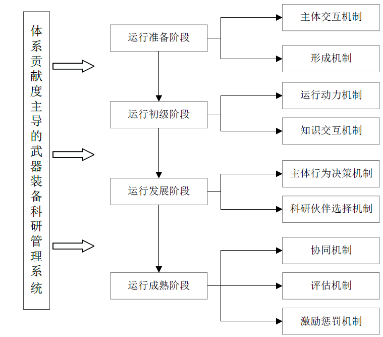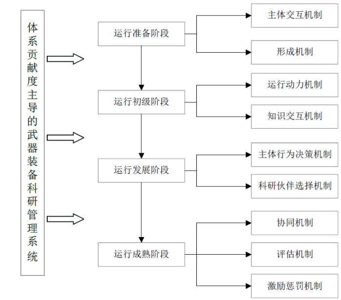 綜上所述,本文認為武器裝備體系貢獻度評估理論層面的完善首先要從基本的管理機制入手,逐步探討體系貢獻度主導的武器裝備科研管理系統(tǒng)的運行規(guī)律,圖1中展示了相關(guān)運行機制與管理系統(tǒng)發(fā)展階段之間的作用關(guān)系。