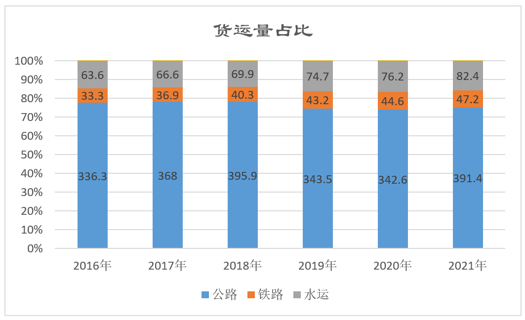 《國(guó)務(wù)院關(guān)于印發(fā)2030年前碳達(dá)峰行動(dòng)方案的通知》(國(guó)發(fā)〔2021〕23號(hào))提出:推動(dòng)不同運(yùn)輸方式合理分工;大力發(fā)展以鐵路、水路為骨干的多式聯(lián)運(yùn);加快大宗貨物和中長(zhǎng)距離貨物運(yùn)輸“公轉(zhuǎn)鐵”“公轉(zhuǎn)水”。《中共中央國(guó)務(wù)院關(guān)于完整準(zhǔn)確全面貫徹新發(fā)展理念做好碳達(dá)峰碳中和工作的意見》(2021年9月22日)提出:優(yōu)化交通運(yùn)輸結(jié)構(gòu);加快建設(shè)綜合立體交通網(wǎng),大力發(fā)展多式聯(lián)運(yùn),提高鐵路、水路在綜合運(yùn)輸中的承運(yùn)比重;優(yōu)化客運(yùn)組織,引導(dǎo)客運(yùn)企業(yè)規(guī)?;⒓s化經(jīng)營(yíng)?!吨泄仓醒?國(guó)務(wù)院關(guān)于深入打好污染防治攻堅(jiān)戰(zhàn)的意見》(2021年11月2日)提出:加快大宗貨物和中長(zhǎng)途貨物運(yùn)輸“公轉(zhuǎn)鐵”“公轉(zhuǎn)水”,大力發(fā)展公鐵、鐵水等多式聯(lián)運(yùn)。“十四五”時(shí)期,鐵路貨運(yùn)量占比提高0.5個(gè)百分點(diǎn),水路貨運(yùn)量年均增速超過2%。推動(dòng)運(yùn)輸結(jié)構(gòu)向綠色低碳方向調(diào)整成為大氣污染防治的關(guān)鍵舉措。