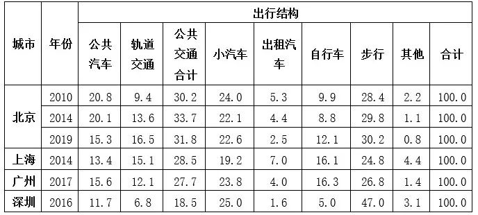 表1 主要城市歷年居民出行交通結(jié)構(gòu)變化(%)