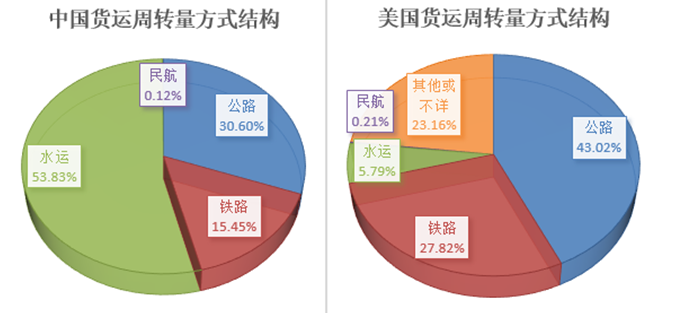 圖3 中美貨運(yùn)周轉(zhuǎn)量方式結(jié)構(gòu)對(duì)比