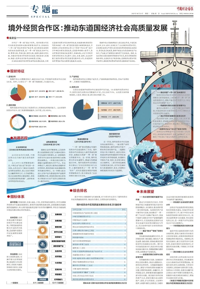 編者按 今年是“一帶一路”倡議提出十周年。境外經(jīng)貿(mào)合作區(qū)作為國內(nèi)國際雙循環(huán)的重要實踐平臺,積極踐行“一帶一路”倡議和國際產(chǎn)能合作,致力于推動東道國的經(jīng)濟社會高質(zhì)量發(fā)展,把“一帶一路”建設(shè)成為和平之路、繁榮之路、開放之路、綠色之路、創(chuàng)新之路和文明之路,為推動開放型世界經(jīng)濟體系建設(shè)、增進各國人民福祉、構(gòu)建人類命運共同體作出新的更大貢獻。 20世紀90年代末期,中國民營企業(yè)開始擴展自身的海外業(yè)務(wù)。這一時期,海外園區(qū)大多服務(wù)于原始初創(chuàng)企業(yè),屬于市場化自發(fā)行為,少有大規(guī)模引進其他大型企業(yè),園區(qū)發(fā)展相對較慢。2006年以來,在商務(wù)部和財政部等相關(guān)部門的不斷規(guī)范與大力推動下,境外經(jīng)貿(mào)合作區(qū)建設(shè)實現(xiàn)長足發(fā)展,合作區(qū)數(shù)量持續(xù)增長,基礎(chǔ)設(shè)施建設(shè)穩(wěn)步推進,產(chǎn)業(yè)集聚效應逐漸顯現(xiàn)。2013年,中國提出建設(shè)“絲綢之路經(jīng)濟帶”和“21世紀海上絲綢之路”重大倡議,為境外經(jīng)貿(mào)合作區(qū)建設(shè)指明了方向。境外經(jīng)貿(mào)合作區(qū)建設(shè)快速推進、規(guī)模不斷擴大,成為推進共建“一帶一路”建設(shè)的重要抓手、國際產(chǎn)能合作的重要平臺、深化雙邊關(guān)系的靚麗“名片”。 為全面反映境外經(jīng)濟貿(mào)易合作區(qū)的建設(shè)成就,不斷完善境外經(jīng)貿(mào)合作區(qū)的評價機制,積極推動境外經(jīng)貿(mào)合作區(qū)和共建“一帶一路”高質(zhì)量發(fā)展不斷取得新成效,中國國際工程咨詢有限公司基于多年研究積累與實踐成果,在商務(wù)部的精心指導,各省市商務(wù)廳和相關(guān)政府部門、金融機構(gòu),以及73家境外經(jīng)貿(mào)合作區(qū)的大力支持下,系統(tǒng)、全面、客觀、公正地開展了境外經(jīng)貿(mào)合作區(qū)高質(zhì)量發(fā)展評價工作,形成《境外經(jīng)濟貿(mào)易合作區(qū)高質(zhì)量發(fā)展報告2023》。 根據(jù)中咨公司數(shù)據(jù)庫統(tǒng)計,截至2022年底,中國已經(jīng)在亞洲、非洲、歐洲、美洲設(shè)立了125家境外經(jīng)貿(mào)合作區(qū),在協(xié)調(diào)東道國生產(chǎn)資源、使用具有競爭優(yōu)勢的低成本勞動力、享受優(yōu)惠關(guān)稅政策,推動中國企業(yè)與東道國形成產(chǎn)業(yè)協(xié)同、產(chǎn)業(yè)鏈上下游聚集方面取得了良好成效。同時,未來還將重點聚焦創(chuàng)新對外投資合作方式,優(yōu)化對外投資結(jié)構(gòu)和布局,完善境外生產(chǎn)服務(wù)網(wǎng)絡(luò),發(fā)揮境外經(jīng)貿(mào)合作區(qū)平臺作用,推動境外經(jīng)貿(mào)合作區(qū)綠色發(fā)展和數(shù)字化轉(zhuǎn)型。 報告總結(jié)并推廣境外經(jīng)貿(mào)合作區(qū)發(fā)展典型案例。伴隨全球化進程的不斷加快以及共建“一帶一路”建設(shè)的深入推進,境外經(jīng)貿(mào)合作區(qū)成為我國與“一帶一路”共建國家經(jīng)濟合作的新方式及未來發(fā)展的新趨勢。本次報告從經(jīng)濟引領(lǐng)、綠色發(fā)展、開放共享等角度梳理總結(jié)高質(zhì)量發(fā)展的典型案例,以期能夠有效推廣可復制的成功經(jīng)驗,為我國境外經(jīng)貿(mào)合作區(qū)建設(shè)提供重要的參考借鑒。 境外經(jīng)貿(mào)合作區(qū)高質(zhì)量發(fā)展20強出爐 此次評價以“創(chuàng)新、協(xié)調(diào)、綠色、開放、共享”的新發(fā)展理念為基本原則,建立五大領(lǐng)域三級指標的綜合評價指標體系,對73個境外經(jīng)貿(mào)合作區(qū)在經(jīng)濟引領(lǐng)、創(chuàng)新驅(qū)動、綠色生態(tài)、開放共享、風險防控等方面的高質(zhì)量發(fā)展狀況進行全面系統(tǒng)地分析評價,結(jié)合新形勢新要求提出具體展望與相關(guān)建議,總結(jié)提煉合作區(qū)高質(zhì)量發(fā)展的經(jīng)驗做法與典型案例,測算得出“境外經(jīng)貿(mào)合作區(qū)高質(zhì)量發(fā)展排名”,并最終形成《境外經(jīng)濟貿(mào)易合作區(qū)高質(zhì)量發(fā)展報告2023》。 境外經(jīng)貿(mào)合作區(qū)高質(zhì)量發(fā)展20強排名中,亞洲12家,占比60.0%,明顯高于亞洲境外經(jīng)貿(mào)合作區(qū)的數(shù)量占比,亞洲境外經(jīng)貿(mào)合作區(qū)發(fā)展質(zhì)量總體較高。亞洲排名靠前的境外經(jīng)貿(mào)合作區(qū)主要包括中國印尼綜合產(chǎn)業(yè)園區(qū)青山園區(qū)、印尼緯達貝工業(yè)園、文萊大摩拉島石油化工園區(qū)、柬埔寨西哈努克港經(jīng)濟特區(qū)、阿治曼中國城等。 現(xiàn)狀特征 1、區(qū)域分布 根據(jù)中咨公司數(shù)據(jù)庫統(tǒng)計,截至 2022 年底,中國境外經(jīng)貿(mào)合作區(qū)達到125家。其中,112家位于“一帶一路”共建國家,占比超89.6%。 2、園區(qū)類型 經(jīng)貿(mào)合作區(qū)以加工制造型為主,科技研發(fā)型相對較少。125 家境外經(jīng)貿(mào)合作區(qū)中,加工制造型數(shù)量最多,為57家,占比45.6%。 3、產(chǎn)業(yè)特征 境外經(jīng)貿(mào)合作區(qū)以傳統(tǒng)產(chǎn)業(yè)為主,產(chǎn)業(yè)結(jié)構(gòu)層次相對較低,主導產(chǎn)業(yè)類型單一,但轉(zhuǎn)型升級趨勢明顯。 4、投資主體