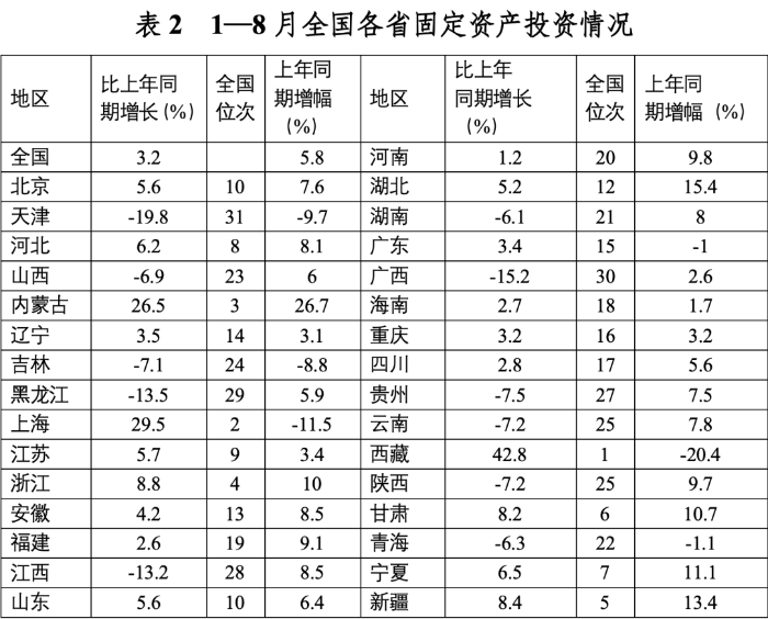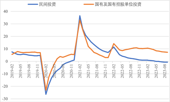 2023年前三季度,我國經(jīng)濟(jì)運行持續(xù)恢復(fù)向好,投資對優(yōu)化供給結(jié)構(gòu)的關(guān)鍵作用顯著增強,高技術(shù)產(chǎn)業(yè)投資保持較快增長,基礎(chǔ)設(shè)施投資、制造業(yè)投資穩(wěn)投資支撐作用進(jìn)一步發(fā)揮。同時,當(dāng)前穩(wěn)投資也面臨新的困難挑戰(zhàn),尤其是房地產(chǎn)市場深度調(diào)整導(dǎo)致房地產(chǎn)開發(fā)投資和民間投資承受較大下行壓力。下一步仍需精準(zhǔn)有力加強逆周期調(diào)控,不斷拓展促投資政策空間,重點圍繞提振房地產(chǎn)市場、推動制造業(yè)轉(zhuǎn)型升級、激發(fā)民間投資活力等方面,繼續(xù)夯實投資復(fù)蘇基礎(chǔ)。 一、固定資產(chǎn)投資整體運行情況 (一)整體投資保持平穩(wěn)增長態(tài)勢 2023年1—9月,我國固定資產(chǎn)投資(不含農(nóng)戶,下同)375035億元,同比增長3.1%,較國內(nèi)生產(chǎn)總值增速低了2.1個百分點,較上半年增速低了0.7個百分點,固定資產(chǎn)投資增速持續(xù)放緩。從投資構(gòu)成看,上半年建安工程、設(shè)備工器具購置、其他費用分別增長2.4%、6.8%、3.1%。設(shè)備工器具購置保持較快增長,反映在各類政策工具支持引導(dǎo)下,企業(yè)設(shè)備購置、技術(shù)改造投入力度加大。 圖1 全國固定資產(chǎn)投資增速(%) 數(shù)據(jù)來源:國家統(tǒng)計局 (二)民間投資意愿和能力仍待恢復(fù) 2023年1—9月,民間固定資產(chǎn)投資為193399億元,同比下降0.6%,較上半年低了0.4個百分點,低于投資整體增速3.7個百分點。從季度波動看,民間固定資產(chǎn)投資的增速由2022年第一季度的8.4%持續(xù)下滑,并連續(xù)兩個季度負(fù)增長。民間固定資產(chǎn)投資占比進(jìn)一步萎縮,跌至2011年以來的最低點,僅為51.57%。 圖2 民間投資增速及占比(%) 數(shù)據(jù)來源:國家統(tǒng)計局,Wind數(shù)據(jù)庫 國家統(tǒng)計局發(fā)布信息顯示,房地產(chǎn)投資中約80%為民間投資。受房地產(chǎn)市場深度調(diào)整影響,民間投資動力和能力相對不足,國有及國有控股單位投資增速連續(xù)20個月高于民間投資增速。2023年1—9月,國有及國有控股單位同比增長7.2%,較民間投資增速高了7.8個百分點。 圖3 民間投資、國有及國有控股單位投資增速(%) 數(shù)據(jù)來源:國家統(tǒng)計局,Wind數(shù)據(jù)庫 (三)制造業(yè)投資保持較快增長,基礎(chǔ)設(shè)施補短板投入加大 2023年1—9月,制造業(yè)和基建投資保持較快增長,房地產(chǎn)投資持續(xù)負(fù)增長,且降幅有所擴(kuò)大?;A(chǔ)設(shè)施投資在專項債等融資支持政策以及重大項目支撐下,效果持續(xù)顯現(xiàn),前三季度基礎(chǔ)設(shè)施投資同比增長8.64%,高于全部投資5.54個百分點,是三大類投資中增長最快的領(lǐng)域。其中,鐵路運輸業(yè)、倉儲業(yè)投資分別大幅增長22.1%、27.7%。截至9月底,新增地方政府專項債已發(fā)行超過3.1萬億元,完成全年專項債額度的80%以上,對基礎(chǔ)設(shè)施投資形成較強支撐。1—9月份,計劃總投資億元及以上項目投資同比增長10.2%,較1—8月快了0.3個百分點,對全部投資增長的貢獻(xiàn)率達(dá)169.2%,大項目投資帶動作用明顯。 數(shù)據(jù)來源:國家統(tǒng)計局,Wind數(shù)據(jù)庫 2023年1—9月,制造業(yè)投資同比增長6.2%,比整體投資高3.1個百分點。其中,高技術(shù)制造業(yè)投資同比增長11.3%,對制造業(yè)投資拉動作用明顯,表明我國制造業(yè)加速轉(zhuǎn)型升級。9月,制造業(yè)采購經(jīng)理指數(shù)(PMI)為50.2%,比上月上升0.5個百分點,重返擴(kuò)張區(qū)間。生產(chǎn)指數(shù)和新訂單指數(shù)均高于臨界點,分別為52.7%和50.5%,表明制造業(yè)生產(chǎn)和市場需求穩(wěn)步回升。裝備制造業(yè)、高技術(shù)制造業(yè)PMI分別為50.6%、50.1%,均位于擴(kuò)張區(qū)間。從企業(yè)規(guī)??矗?、中、小型企業(yè)PMI分別為51.6%、49.6%和48%,其中大型企業(yè)PMI較上月回升0.8個百分點,為近6個月高點,表現(xiàn)出強勁恢復(fù)發(fā)展動能。 圖4:制造業(yè)PMI指數(shù)(%) 數(shù)據(jù)來源:國家統(tǒng)計局,Wind數(shù)據(jù)庫 2023年1—9月,房地產(chǎn)開發(fā)投資增速持續(xù)放緩,房地產(chǎn)開發(fā)投資、住宅開發(fā)投資分別同比下降9.1%、8.4%。房地產(chǎn)開發(fā)投資占固定資產(chǎn)投資完成額的比重降至23.3%,較上半年下降0.8個百分點,為今年以來最低值。房屋施工面積、房屋新開工面積等先行指標(biāo)均出現(xiàn)明顯下滑,分別同比下降7.1%、23.4%。1—9月,國房景氣指數(shù)均位于100以下,自4月以來持續(xù)走低。 圖5 三大領(lǐng)域固定資產(chǎn)投資增速(累計同比,%) 數(shù)據(jù)來源:國家統(tǒng)計局,Wind數(shù)據(jù)庫 (四)東部地區(qū)投資保持較快增長,東北地區(qū)投資下滑明顯 從投資地域看,三季度東北地區(qū)投資轉(zhuǎn)為負(fù)增長,1—9月累計同比下降2.7%,較全國水平低了5.8個百分點。東部地區(qū)投資同比增長5.4%,保持較高增速。西部地區(qū)投資同比微降0.4%,增速由正轉(zhuǎn)負(fù)。中部地區(qū)投資同比下降0.9%,降幅較上半年收窄0.8個百分點。 圖6 分地區(qū)固定資產(chǎn)投資增速(累計同比,%) 數(shù)據(jù)來源:國家統(tǒng)計局,Wind數(shù)據(jù)庫 1—8月,31個省份中有15個省投資增速高于全國水平,其中西藏、上海、內(nèi)蒙古等3省實