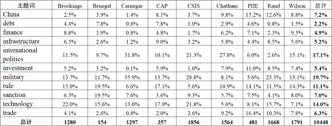 本研究選取9家全球最頂級智庫,分別是美國布魯金斯學(xué)會(Brookings)、美國卡內(nèi)基國際和平基金會(Carnegie)、比利時(shí)布魯蓋爾研究所(Bruegel)、美國戰(zhàn)略與國際問題研究中心(CSIS)、英國皇家國際事務(wù)研究所(Chatham)、美國蘭德公司(Rand)、美國彼得森國際經(jīng)濟(jì)研究所(PIIE)、威爾遜中心(Wilson)和美國進(jìn)步中心(CAP)。