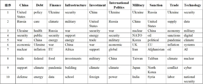 通過分析2022年全球知名智庫不同研究主題的高頻詞(見附件2),可以窺見美歐智庫對不同主題的關(guān)注重點(diǎn),并預(yù)測未來的國際政治經(jīng)濟(jì)形勢。