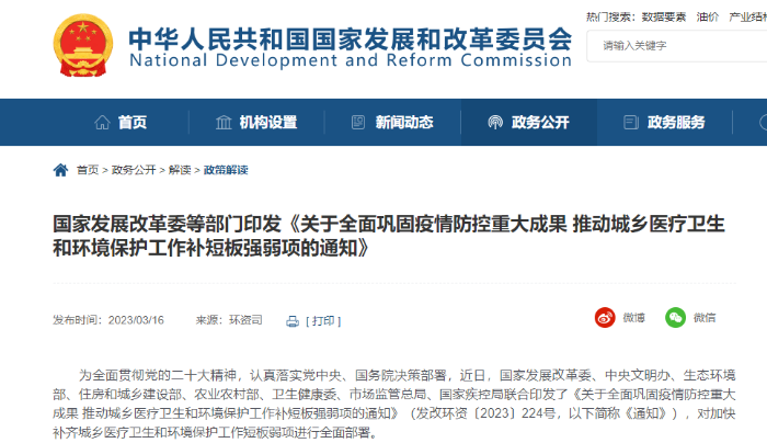 全面鞏固疫情防控重大成果,加強(qiáng)醫(yī)療衛(wèi)生和環(huán)境保護(hù)工作是最大程度保護(hù)人民生命安全和身體健康,最大限度減少疫情對經(jīng)濟(jì)社會發(fā)展的影響,推動經(jīng)濟(jì)平穩(wěn)健康發(fā)展的重要舉措。近日,國家發(fā)展改革委、中央文明辦、生態(tài)環(huán)境部、住房和城鄉(xiāng)建設(shè)部、農(nóng)業(yè)農(nóng)村部、國家衛(wèi)生健康委、市場監(jiān)管總局、國家疾控局聯(lián)合印發(fā)《關(guān)于全面鞏固疫情防控重大成果 推動城鄉(xiāng)醫(yī)療衛(wèi)生和環(huán)境保護(hù)工作補(bǔ)短板強(qiáng)弱項的通知》(發(fā)改環(huán)資〔2023〕224號,以下簡稱《通知》),對全面鞏固疫情防控重大成果,加快補(bǔ)齊城鄉(xiāng)醫(yī)療衛(wèi)生和環(huán)境保護(hù)短板弱項作出系統(tǒng)部署?!锻ㄖ肥锹鋵嶞h的二十大精神的具體舉措,對推動城鄉(xiāng)醫(yī)療衛(wèi)生和環(huán)境保護(hù)工作取得更大進(jìn)展,加快建設(shè)健康中國、美麗中國具有重要意義。