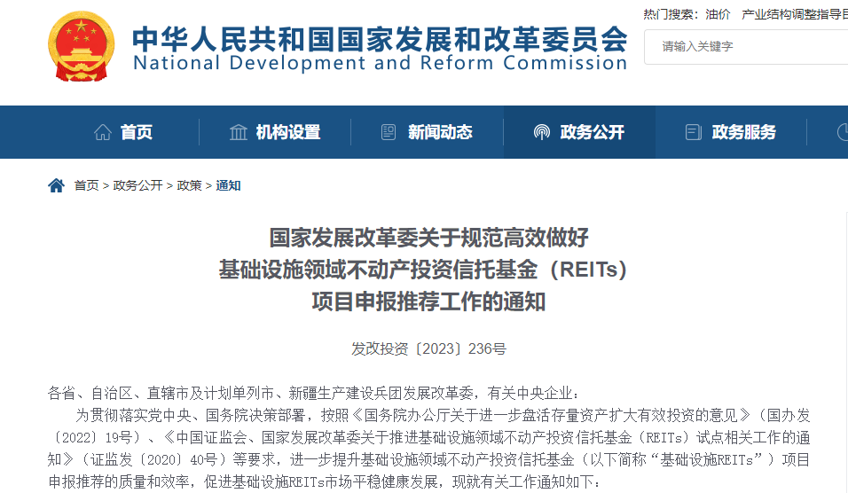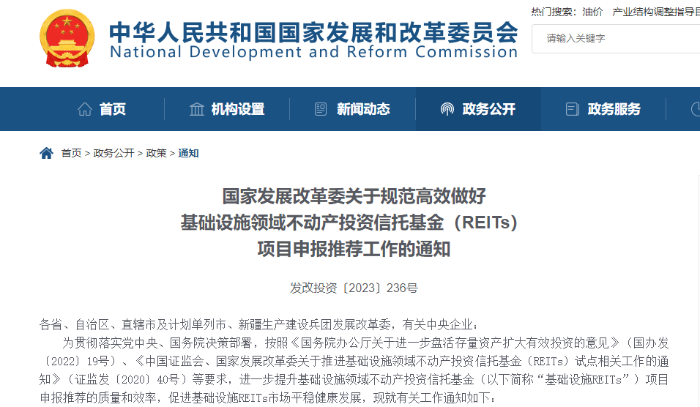 發(fā)展是第一要務(wù),改革是根本動力?;A(chǔ)設(shè)施REITs是盤活存量資產(chǎn)促進投資發(fā)展的重大舉措,是投融資體制改革的重大創(chuàng)新。自2020年4月基礎(chǔ)設(shè)施REITs試點40號文發(fā)布以來,歷經(jīng)2020年8月的586號文、2021年7月的958號文和2022年7月的617號文等政策出臺,REITs項目申報推薦工作制度體系在總結(jié)試點經(jīng)驗的基礎(chǔ)上不斷完善。2023年3月24日,國家發(fā)展改革委重磅發(fā)布《關(guān)于規(guī)范高效做好基礎(chǔ)設(shè)施領(lǐng)域不動產(chǎn)投資信托基金(REITs)項目申報推薦工作的通知》(發(fā)改投資〔2023〕236號,以下簡稱236號文),這是對REITs試點工作的前期準(zhǔn)備、發(fā)行條件、審核流程、專業(yè)支撐、募投項目、運營管理等要求的系統(tǒng)總結(jié)和再次升華,體現(xiàn)了申報推薦工作規(guī)范化、標(biāo)準(zhǔn)化、精細(xì)化的管理轉(zhuǎn)型,對于進一步提升項目申報推薦的質(zhì)量和效率、推進基礎(chǔ)設(shè)施REITs常態(tài)化發(fā)行具有重要指導(dǎo)意義。