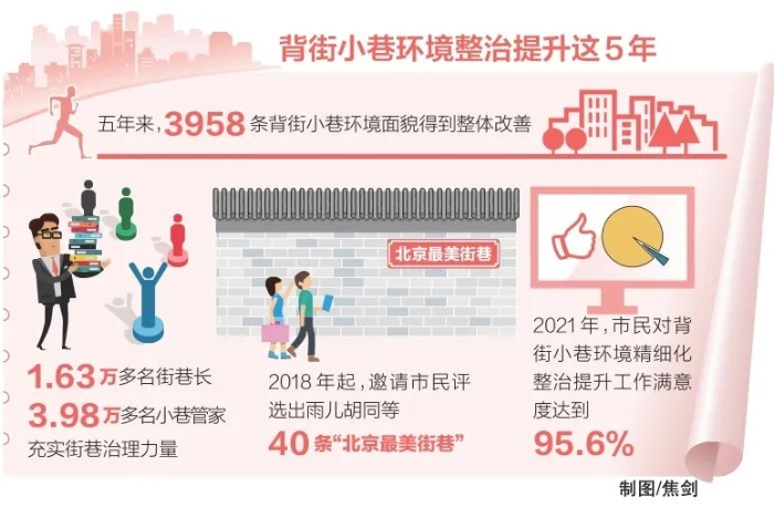 背街小巷,是指城市主要街道后面的小巷、弄堂、胡同等生活空間。背街小巷是城市病集中的地方,是城市管理的薄弱環(huán)節(jié)。北京的很多老胡同公共服務(wù)設(shè)施很不完善,環(huán)境衛(wèi)生狀況差,四合院內(nèi)私搭亂建、擁擠雜亂、通道狹窄,建筑老化、房屋質(zhì)量差。為改善胡同居民環(huán)境,提升城市生活品質(zhì),2017年3月,時任北京市市長蔡奇同志在察訪東城區(qū)和西城區(qū)背街小巷環(huán)境整治時提出建立“街長”“巷長”制,把責(zé)任落實到街道、社區(qū),創(chuàng)建一批示范街面、精品胡同[3]。2017年4月,北京市制定印發(fā)了《首都核心區(qū)背街小巷環(huán)境整治提升三年(2017-2019年)行動方案》,要求對首都核心區(qū)2435條背街小巷進(jìn)行環(huán)境整治,“抓創(chuàng)建、治頑癥、促提升”,更好地保護(hù)古都風(fēng)貌,留住北京城市的“魂”,做到“十有十無一創(chuàng)建”:環(huán)衛(wèi)作業(yè)有隊伍、交通停車有規(guī)范、街巷立面有管護(hù)、公服設(shè)施有維護(hù)、綠化美化有養(yǎng)護(hù)、街容巷貌有巡查、違法行為有查處、居民群眾有自治、督導(dǎo)檢查有力度、示范引領(lǐng)有標(biāo)桿;無私搭亂建、無開墻打洞、無亂停車、無亂占道、無亂搭架空線、無外立面破損、無違規(guī)廣告牌匾、無道路破損、無違規(guī)經(jīng)營、無堆物堆料;創(chuàng)建文明街巷。從2017年起,三年間全市共對3000余條背街小巷進(jìn)行了環(huán)境改造。2020年北京啟動新一輪“背街小巷環(huán)境精細(xì)化整治提升三年行動計劃”,緊緊圍繞居民“幼有所育、學(xué)有所教、勞有所得、病有所醫(yī)、老有所養(yǎng)、住有所居、弱有所扶”“便利性、宜居性、多樣性、公正性、安全性”“七有”“五性”需求,在達(dá)到“十無”標(biāo)準(zhǔn)基礎(chǔ)上實現(xiàn)“五好”標(biāo)準(zhǔn)(公共環(huán)境好、社會秩序好、道德風(fēng)尚好、同創(chuàng)共建好、宣傳氛圍好),覆蓋了全市16個區(qū),計劃到2022年年底前,全市完成3261條達(dá)標(biāo)類、精治類背街小巷環(huán)境精細(xì)化整治提升任務(wù),同時做好1026條維護(hù)類背街小巷環(huán)境的日常管護(hù)[4]。