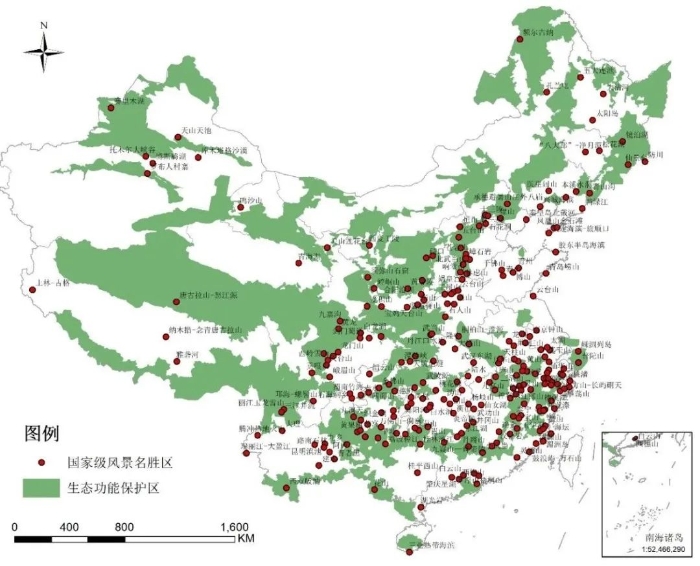 圖1 中國(guó)關(guān)鍵生態(tài)功能保護(hù)區(qū)中國(guó)家級(jí)風(fēng)景名勝區(qū)之分布(制圖:孫艷芝)