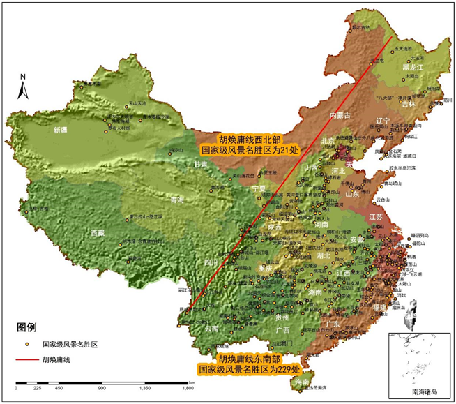 圖2 胡煥庸線下的中國(guó)國(guó)家級(jí)風(fēng)景名勝區(qū)分布(制圖:孫艷芝)