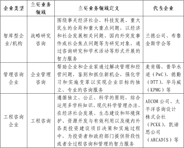基于中咨公司業(yè)務(wù)范圍與自身戰(zhàn)略規(guī)劃,本次研究將重點(diǎn)選取全球領(lǐng)先的智庫(kù)型企業(yè)、管理咨詢企業(yè)、工程咨詢企業(yè)進(jìn)行對(duì)比研究。