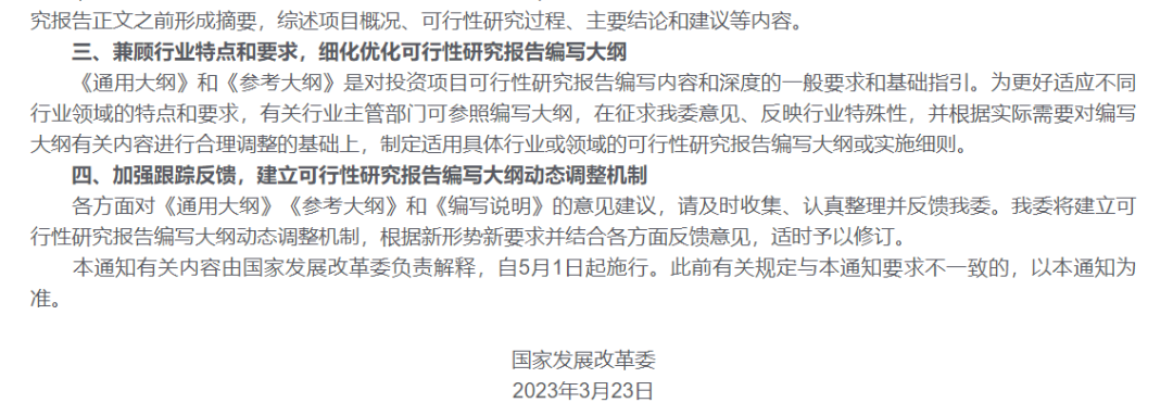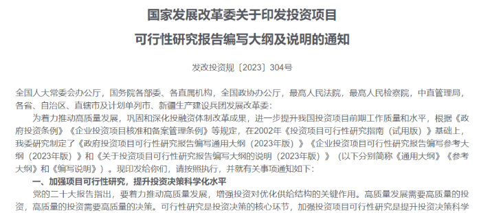 高質(zhì)量發(fā)展是中國(guó)式現(xiàn)代化的本質(zhì)要求。高質(zhì)量發(fā)展需要高質(zhì)量的投資,高質(zhì)量的投資需要高質(zhì)量的投資決策,高質(zhì)量的可行性研究是確保投資科學(xué)決策的重要基礎(chǔ)。近日,國(guó)家發(fā)展改革委出臺(tái)《關(guān)于印發(fā)投資項(xiàng)目可行性研究報(bào)告編寫大綱及說明的通知》(發(fā)改投資規(guī)〔2023〕304號(hào),點(diǎn)擊閱讀原文),正式發(fā)布《政府投資項(xiàng)目可行性研究報(bào)告編寫通用大綱(2023版)》和《企業(yè)投資項(xiàng)目可行性研究報(bào)告編寫參考大綱(2023版)》(簡(jiǎn)稱《可研大綱》) ,這是繼《投資項(xiàng)目可行性研究指南(試用版)》(簡(jiǎn)稱《可研指南》),時(shí)隔二十年之后國(guó)家投資主管部門發(fā)布的關(guān)于規(guī)范投資項(xiàng)目可行性研究報(bào)告編寫工作的新的綱領(lǐng)性文件,對(duì)于我國(guó)新時(shí)代投資項(xiàng)目科學(xué)決策、推動(dòng)實(shí)現(xiàn)高質(zhì)量投資具有里程碑意義,標(biāo)志著我國(guó)投資項(xiàng)目可行性研究工作將邁入高質(zhì)量論證的新階段。