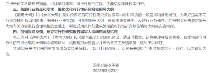 國(guó)家發(fā)展改革委本次發(fā)布的《可研大綱》,以政府投資項(xiàng)目《通用大綱》和企業(yè)投資項(xiàng)目《參考大綱》的形式呈現(xiàn)。兩個(gè)大綱在保持各類項(xiàng)目可行性研究的通用性要求的前提下,同時(shí)強(qiáng)調(diào)政府投資項(xiàng)目與企業(yè)投資項(xiàng)目可行性研究報(bào)告特定內(nèi)容應(yīng)體現(xiàn)明顯差異。