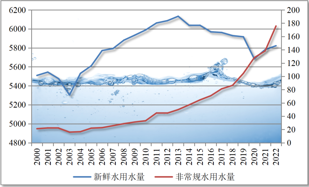 圖6 2000-2022年全國(guó)用水總量中新鮮水和非常規(guī)水變化(單位:億m3)