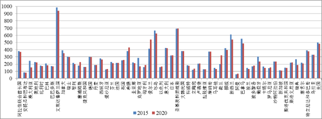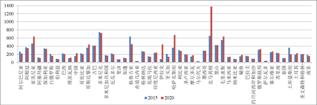 圖9 2015和2020年中等高收入國(guó)家人均生活用水量對(duì)比圖(基數(shù)為淡水取用量,L/d)