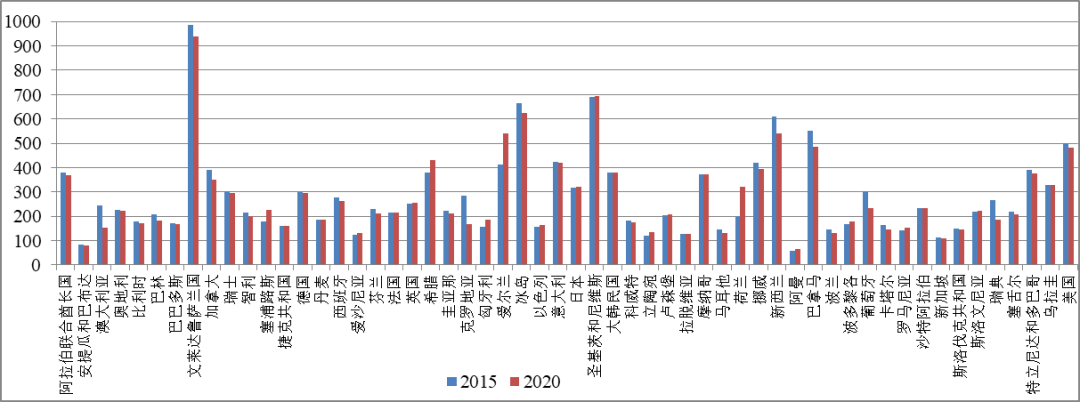 圖10 2015和2020年高收入國(guó)家人均生活用水量對(duì)比圖(基數(shù)為淡水取用量,L/d)