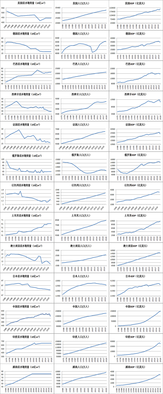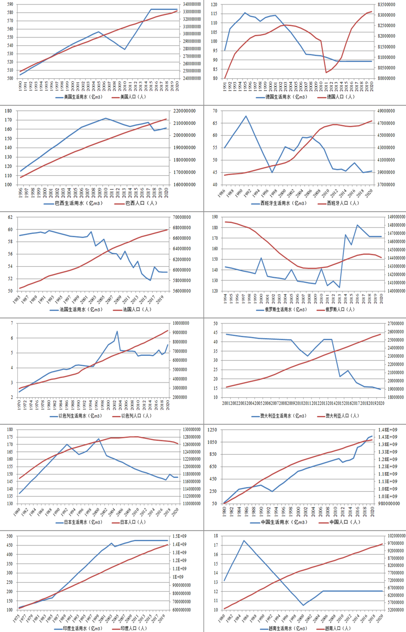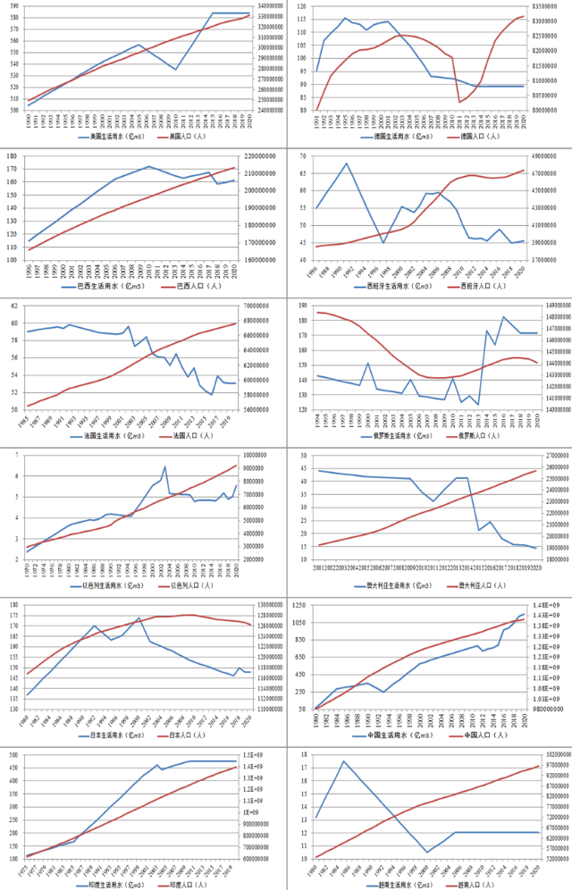 圖11 典型國(guó)家多年來生活用水與人口關(guān)系變化