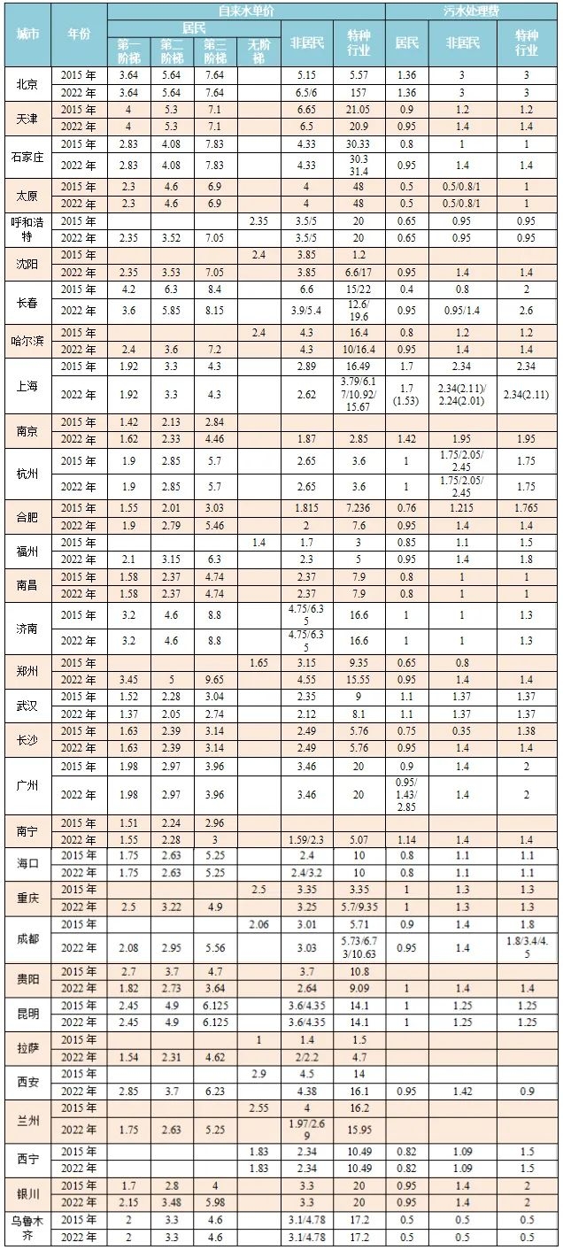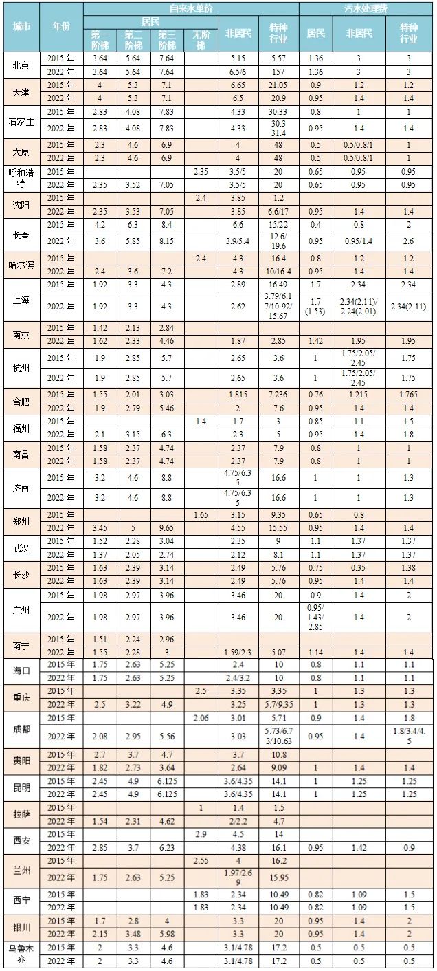 表3 2015年、2022年31個(gè)城市自來水單價(jià)和污水處理費(fèi)統(tǒng)計(jì)對(duì)比表[4]    單位:元/m3