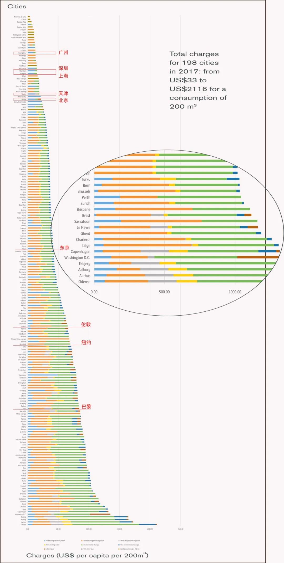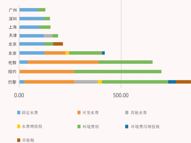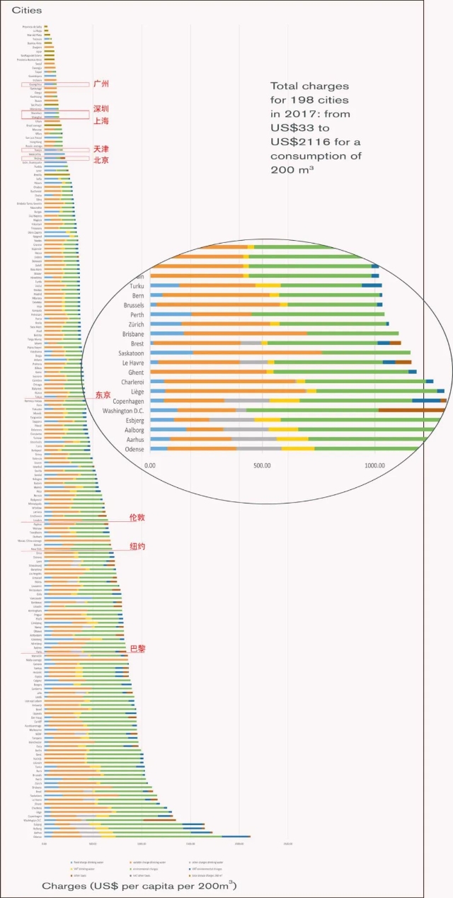 有研究提出,紐約、倫敦、東京、巴黎和新加坡家庭水費(fèi)支出占城市家庭收入的比例介于0.58%~1.10%,平均為0.76%,國(guó)內(nèi)典型城鎮(zhèn)介于0.24%~0.42%,國(guó)內(nèi)明顯低于國(guó)際。IWA Statistics and Economics組織編寫了International Statistics for Water Services 2018并于去年10月的國(guó)際水協(xié)世界水大會(huì)上正式發(fā)布,總結(jié)了2017年39個(gè)國(guó)家198個(gè)城市水費(fèi)情況,見圖12。按水費(fèi)從小到大進(jìn)行排序,北京排在第33位(廣州、深圳、上海、天津排位更靠前)。選擇紐約、倫敦、東京、巴黎等國(guó)際典型城市與我國(guó)典型城市進(jìn)一步比對(duì),從水費(fèi)組成看,我國(guó)水價(jià)和排污費(fèi)均明顯偏低,見圖13。因此,從資源保護(hù)、環(huán)境治理、高質(zhì)量發(fā)展要求等方面看,我國(guó)水價(jià)調(diào)整勢(shì)在必行。農(nóng)業(yè)是用水大戶,加快推進(jìn)農(nóng)業(yè)水價(jià)綜合改革也是節(jié)水潛力所在。未來進(jìn)一步落實(shí)兩手發(fā)力,在價(jià)格杠桿調(diào)節(jié)供求后,提高用水效率、進(jìn)一步節(jié)水還有空間。