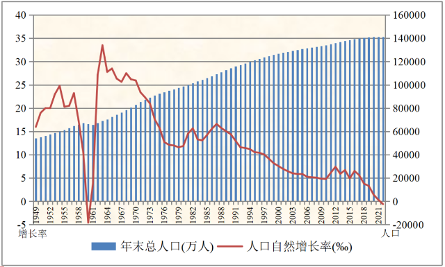 圖4 1949-2022年全國(guó)年末總?cè)丝谂c人口自然增長(zhǎng)率變化