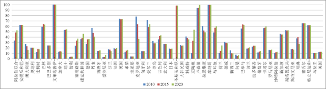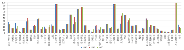 圖7 2010、2015和2020年中等高收入國(guó)家生活占抽取淡水資源百分比(%)