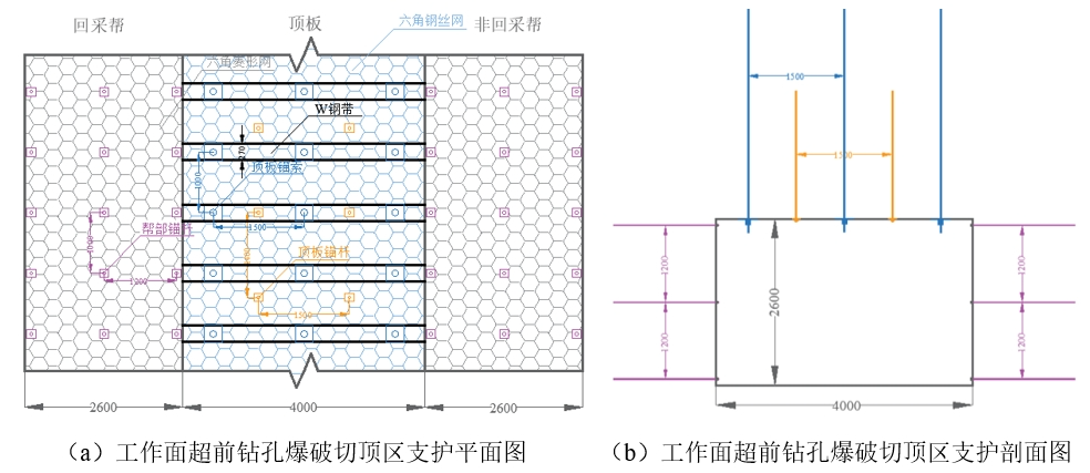 薄煤層開采沿空留巷關(guān)鍵技術(shù)研究 趙法森 吳城樂 林科文 劉飛翔 摘 要:為了確定堅硬頂板下薄煤層沿空留巷切頂鉆孔爆破參數(shù)及圍巖控制方案,以山東某礦21602工作面運輸巷為工程背景,運用理論分析、數(shù)值模擬及現(xiàn)場實測的手段進(jìn)行了研究。論文將沿空留巷劃分為三個階段,并基于計算結(jié)果給出了相應(yīng)的巷道圍巖支護(hù)方案。現(xiàn)場應(yīng)用結(jié)果表明:合理的鉆孔爆破高度為4.5m,切頂角度為70°;現(xiàn)場實施爆破后,留巷穩(wěn)定后頂板累計變形量為118mm,底板累計變形量為344mm,實體煤側(cè)累計變形量為402mm,能滿足留巷后期使用要求。相關(guān)研究成果已在21602工作面進(jìn)行了現(xiàn)場應(yīng)用,為同等條件下實施沿空留巷提供了借鑒。 關(guān)鍵詞:切頂留巷;薄煤層;堅硬頂板;巷道圍巖控制 傳統(tǒng)的留設(shè)煤柱開采方式不僅在經(jīng)濟方面不占任何優(yōu)勢,還造成大量煤炭資源浪費,由于所留設(shè)的煤柱往往出現(xiàn)應(yīng)力集中現(xiàn)象,引起巷道圍巖變形破壞,不利于巷道的維護(hù)使用[1-4]。因此,沿空留巷技術(shù)是解決上述問題的主要方式之一。沿空留巷取消了煤柱,提高了礦井的回采率[5-8],延長了礦井的服務(wù)年限,大幅度降低掘進(jìn)率,緩解采掘接替矛盾。相關(guān)數(shù)據(jù)表明,沿空留巷可提高煤炭回收率10%以上,巷道掘進(jìn)率可降低30%左右,明顯改善采掘接續(xù)關(guān)系[9-10]。切頂卸壓沿空留巷技術(shù)具有工藝簡單、性價比高、留巷速度快的優(yōu)點,尤其對堅硬頂板下沿空留巷具有明顯的優(yōu)越性[11]。 山東某礦主采平均厚度為1.35m的16#煤層,其直接頂為普氏系數(shù)大于8、平均厚度4.6m的堅硬灰?guī)r。為盡可能回收堅硬煤層下薄煤層的煤炭資源并緩解采掘接續(xù)緊張問題,采用爆破切頂沿空留巷技術(shù)來提高煤炭資源的回收率。以21602工作面運輸巷為工程背景,采用數(shù)值模擬以及現(xiàn)場監(jiān)測相結(jié)合的研究手段,確定了爆破切頂、巷道圍巖穩(wěn)定性控制等關(guān)鍵技術(shù)參數(shù)并在現(xiàn)場進(jìn)行了成功應(yīng)用。 一、工程概況 山東某礦21602工作面主采16#煤層,煤層平均厚度為1.35m,平均傾角為4°,平均埋深535m。該工作面走向長度為233m,傾斜長度為200m,采用綜合機械化開采。煤層及頂?shù)装鍘r性詳細(xì)情況見表1,直接頂和基本頂為堅硬灰?guī)r,厚度3.5-5.8m,硬度系數(shù)f=8~10。 表1 21602工作面主要圍巖情況 為緩解工作面采掘接替緊張,對21602工作面運輸巷部分區(qū)段進(jìn)行沿空留巷作業(yè),將其作為21606工作面材料巷,沿空留巷區(qū)段如圖1所示。運輸巷沿煤層頂板掘進(jìn),為半煤巖巷道,巷道斷面為矩形,凈高4m,凈寬2.6m。 圖1 工作面布置平面圖 工作面超前未切頂區(qū),巷道頂板穩(wěn)定性良好,根據(jù)工作面以往巷道實際來壓情況及支護(hù)設(shè)計[12-13],確定21602運輸巷工作面超前未切頂區(qū)巷道支護(hù)形式為“錨桿+六角菱形網(wǎng)”支護(hù)方式。其具體支護(hù)參數(shù)為:頂部錨桿為兩排螺紋錨桿,規(guī)格為φ20×2000mm,頂板錨桿間排距為:1400×1500mm;幫部錨桿為金屬螺紋錨桿,規(guī)格為φ16×1600mm,幫部錨桿間排距為:1000×1200mm,并掛六角菱形網(wǎng)支護(hù);錨桿托盤規(guī)格為:100×100×10mm。 二、21602工作面運輸巷切頂留巷關(guān)鍵技術(shù)參數(shù)確定 (一)理論分析 1.切頂高度計算 在無煤柱沿空留巷過程中,巷道圍巖的穩(wěn)定受到多種因素的綜合影響,其中切頂高度對沿空留巷的礦壓顯現(xiàn)具有非常顯著的影響[14-15]。切頂高度應(yīng)綜合考慮上覆堅硬頂板的結(jié)構(gòu)與高位巖層的破斷運移特征,保證難垮落頂板在采動應(yīng)力作用下順利沿切頂弱面切落。切頂高度的計算過程具體如下[16]: 假設(shè)切頂高度范圍內(nèi)有i層巖層,巖層編號自下向上依次為1、2、…、i,則: 式(1)可表示為: 已知: 則有: 式中,hq為切頂高度,m;H1…Hj為1…j層頂板巖層厚度(Hj為第j層頂板巖層厚度),m;M為采高,取1.35m;k1…ki 為1…i層頂板巖層碎脹系數(shù)(ki為第i層頂板巖層碎脹系數(shù));kp為加權(quán)平均碎脹系數(shù),取1.3~1.4;代入式(4),可得最合適的切頂高度應(yīng)為3.4~4.5m。 2.切頂角度分析 將切頂角度α定義為切頂與水平方向的夾角,切頂角度的大小對沿空留巷的圍巖穩(wěn)定和頂板下沉量的控制有一定的影響,切頂與水平方向角度越?。?/span> ),側(cè)向懸臂附加應(yīng)力越大,同時斷裂面下采空區(qū)的充填效果差,巷道頂板易出現(xiàn)較大旋轉(zhuǎn)變形;切頂與水平方向角度越大( ),會對爆破線附近的錨桿索產(chǎn)生擾動破壞,不利于巷道穩(wěn)定[17]。因此,最合適的切頂角度應(yīng)在70°至90°之間。 (二)數(shù)值模擬及參數(shù)選擇 1.模型構(gòu)建 本模型以21602工作面地質(zhì)生產(chǎn)條件為背景,建立沿空留巷FLAC3D數(shù)值計算模型。模型尺寸為長×寬×高=200m×140m×62.6m,模型四周約束水平位移,底部約束水平和垂直位移,頂部施加均布載荷。載荷的大小為模型頂部巖層的重量,100m深巖石自重取2.6MPa,施加均布載荷的大小為12.3MPa,模型單元采用Mohr-Coulomb本構(gòu)模型,各巖層厚度及基本物理力學(xué)參數(shù)見表2。模擬巷道開挖尺寸為200m×4m×2.6m,工作面開挖尺寸為50m×80m×1.35m,在模型中需要切