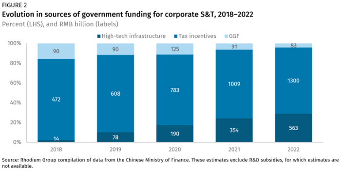 過去十年間,政府還通過補貼和稅收優(yōu)惠,以及股權融資和高科技基礎設施等間接手段,加大了對企業(yè)研發(fā)的支持力度(圖 2)。所有資金來源都實現(xiàn)了快速增長,但僅稅收返還一項在2018年至2022年間的年均增長率就高達 28.8%,成為政府為企業(yè)研發(fā)提供資金的最大來源,到2022年將達到1.3萬億元人民幣(1933億美元)。