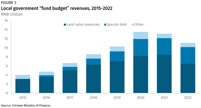 “新基建”和政府贈款基金由地方政府通過政府專項 “基金預算”提供資金(圖 3)。這些預算依賴于土地收入和債務,因此與過去的預算資金相比受到的限制較少。2021年至2022年 ,土地出讓收入下降了23%,而不可持續(xù)的債務水平和不斷上升的利息支出限制了地方政府利用更多債務為新項目融資的能力。即使在廣東和江蘇這樣的發(fā)達省份,2015年至2021 年間,相關利息支出占公共收入的比重也分別增長了30%和25%,分別占財政收入的5.4%和7.3%。
