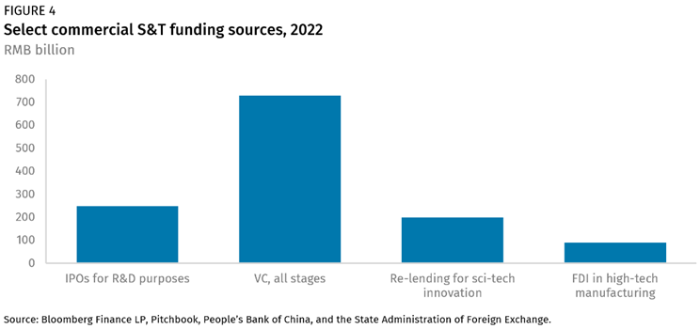 最后,中國經(jīng)濟增長承壓也會影響構成中國企業(yè)研發(fā)資金另外約45%的商業(yè)來源。大多數(shù)商業(yè)資金來自企業(yè)利潤再投資。但對于收支不平衡的企業(yè)來說,風險投資(VC)和私募股權投資(PE)也是重要的資金來源。最后,企業(yè)通常通過首次公開募股融資、優(yōu)惠貸款或商業(yè)貸款籌集研發(fā)資金,在中國的銀行體系中,創(chuàng)新型企業(yè)可以廣泛獲得這些資金(圖 4)。