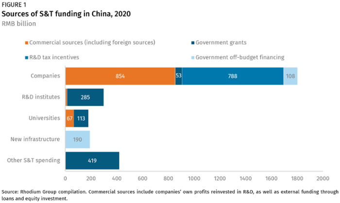 與世界其他地方一樣,中國創(chuàng)新生態(tài)系統(tǒng)的資金來自各種商業(yè)和公共來源,并流向廣泛的公共和私人科技行為者。然而,與其他大型和技術發(fā)達的經(jīng)濟體相比,政府相關來源在中國發(fā)揮著主導作用,約占流入中國科技生態(tài)系統(tǒng)的所有資金的60%(見圖1)。