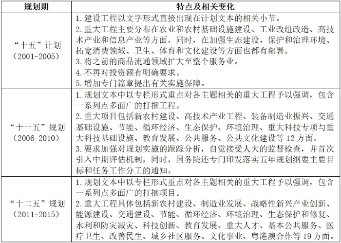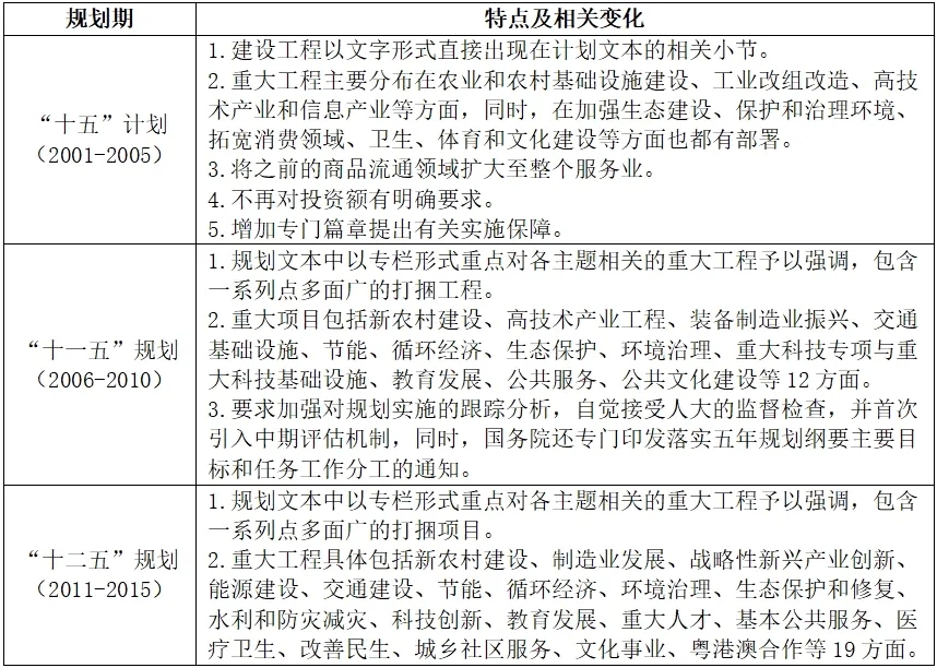 表3 “十五”至“十二五”規(guī)劃(計(jì)劃)中的重大工程特點(diǎn)
