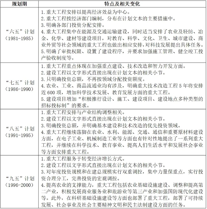 表2 “六五”至“九五”計(jì)劃中的重大工程特點(diǎn)