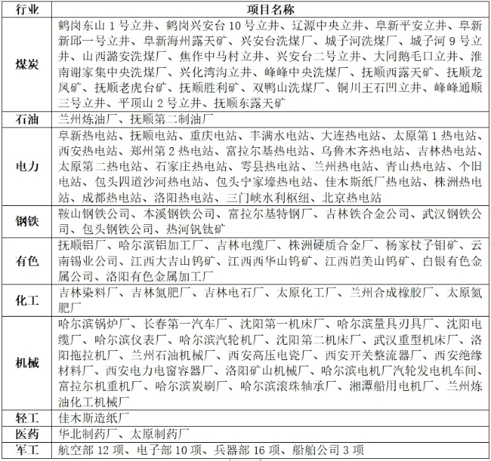 表1 “一五”計(jì)劃中的156個(gè)重點(diǎn)項(xiàng)目