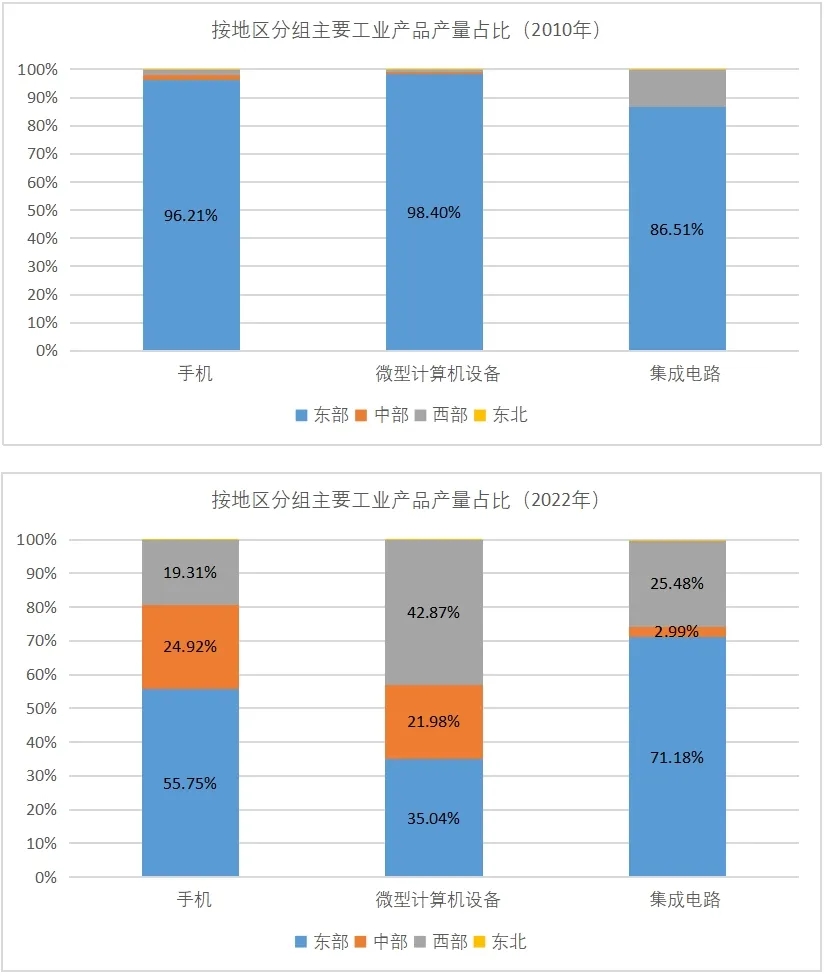 我國(guó)產(chǎn)業(yè)轉(zhuǎn)移的結(jié)構(gòu)不斷升級(jí),中西部地區(qū)除主要承接?xùn)|部地區(qū)調(diào)整優(yōu)化的勞動(dòng)密集型產(chǎn)業(yè)外,還積極利用產(chǎn)業(yè)基礎(chǔ)和資源稟賦優(yōu)勢(shì),加大電子信息等資本密集型和技術(shù)密集型產(chǎn)業(yè)承接力度,整體呈現(xiàn)出產(chǎn)業(yè)轉(zhuǎn)移與產(chǎn)業(yè)升級(jí)并行趨勢(shì)。近年來(lái),戰(zhàn)略性新興產(chǎn)業(yè)也開(kāi)始向中西部核心城市集聚,如合肥芯片產(chǎn)業(yè)、武漢光纖通信產(chǎn)業(yè)、西安半導(dǎo)體產(chǎn)業(yè)、重慶新能源汽車產(chǎn)業(yè)等。2010-2022年,我國(guó)東部地區(qū)手機(jī)、微型計(jì)算機(jī)、集成電路等主要工業(yè)產(chǎn)品產(chǎn)量占全國(guó)比重分別下降40、63和15個(gè)百分點(diǎn);而中部地區(qū)三種產(chǎn)品占比分別上升23、21和3個(gè)百分點(diǎn),西部地區(qū)三種產(chǎn)品占比分別上升18、42和12個(gè)百分點(diǎn)。