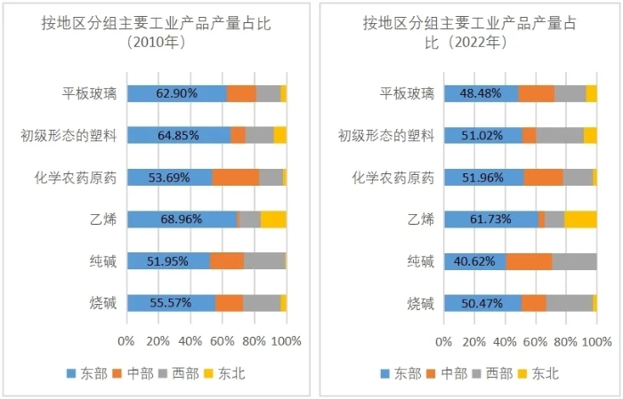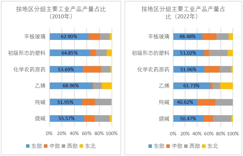 隨著城市化的不斷推進(jìn)和經(jīng)濟(jì)的快速發(fā)展,東部地區(qū)能源、土地、環(huán)境等要素供給日趨緊張,碳排放的限制也會(huì)加快部分高耗能產(chǎn)業(yè)向原材料豐富、新能源富集的中西部地區(qū)疏散轉(zhuǎn)移。近年來(lái),全國(guó)電解鋁“北鋁南移、東鋁西移”,云南依托可再生能源資源優(yōu)勢(shì)主動(dòng)承接電解鋁產(chǎn)能轉(zhuǎn)移,全省電解鋁產(chǎn)能接近全國(guó)的五分之一。全國(guó)實(shí)施“東數(shù)西算”工程,8個(gè)國(guó)家算力樞紐節(jié)點(diǎn)西部地區(qū)占據(jù)5個(gè),10個(gè)國(guó)家數(shù)據(jù)中心集群西部地區(qū)占據(jù)7個(gè)。此外,玻璃、塑料及化工產(chǎn)品產(chǎn)業(yè),受東部地區(qū)環(huán)境容量和環(huán)境監(jiān)管限制而向中西部地區(qū)轉(zhuǎn)移。2010-2022年,東部地區(qū)平板玻璃、初級(jí)形態(tài)的塑料、化學(xué)農(nóng)藥原藥、乙烯、純堿、燒堿等主要工業(yè)產(chǎn)品產(chǎn)量占全國(guó)比重分別下降14、14、2、7、11和5個(gè)百分點(diǎn),而西部地區(qū)占比分別上升5、13、4、0.2、3和7個(gè)百分點(diǎn)。