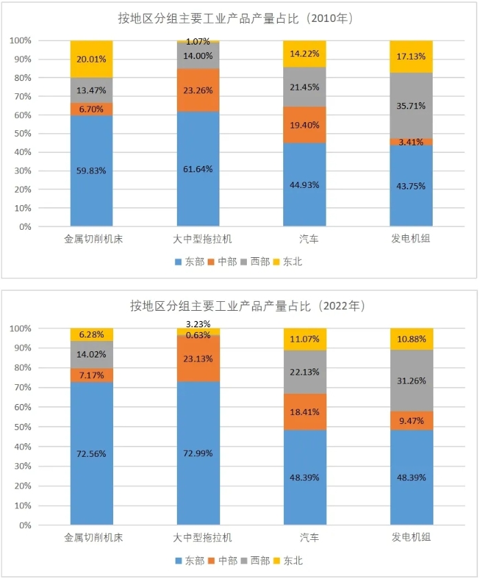 隨著我國(guó)基礎(chǔ)設(shè)施建設(shè)大發(fā)展,中西部交通運(yùn)輸條件與東部的差距在不斷縮小,特別是互聯(lián)網(wǎng)、移動(dòng)通信等新型基礎(chǔ)設(shè)施的發(fā)展,使得企業(yè)可以在不同地區(qū)通過(guò)遠(yuǎn)程辦公、在線會(huì)議等進(jìn)行業(yè)務(wù)協(xié)作和管理,“遠(yuǎn)程研發(fā)+異地中試+異地生產(chǎn)+異地操作”等模式應(yīng)運(yùn)而生。以汽車產(chǎn)業(yè)為例,國(guó)內(nèi)知名車企相繼進(jìn)入中西部,在重慶、成都、武漢、長(zhǎng)沙、鄭州等地建成了相當(dāng)規(guī)模的整車和零部件生產(chǎn)基地,但其研發(fā)中心依然設(shè)置在東部沿海發(fā)達(dá)地區(qū)。同時(shí),中西部和東北地區(qū)也可以通過(guò)在東部地區(qū)設(shè)立研發(fā)基地,快速獲取發(fā)達(dá)地區(qū)人才、區(qū)位、資金優(yōu)勢(shì)。此外,東北和西部地區(qū)部分傳統(tǒng)優(yōu)勢(shì)產(chǎn)業(yè)出現(xiàn)向東部地區(qū)轉(zhuǎn)出的現(xiàn)象。2010-2022年,東北地區(qū)金屬切削機(jī)床、汽車和發(fā)電機(jī)組等主要工業(yè)產(chǎn)品產(chǎn)量占全國(guó)比重分別下降14、3和6個(gè)百分點(diǎn),西部地區(qū)大中型拖拉機(jī)占比下降13個(gè)百分點(diǎn);而同期東部地區(qū)金屬切削機(jī)床、大中型拖拉機(jī)、汽車和發(fā)電機(jī)組等主要工業(yè)產(chǎn)品產(chǎn)量占比分別上升13、11、3和5個(gè)百分點(diǎn)。