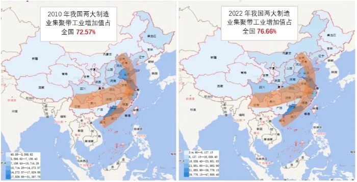 圖4 2010-2022年我國(guó)兩大制造業(yè)集聚帶工業(yè)增加值占比