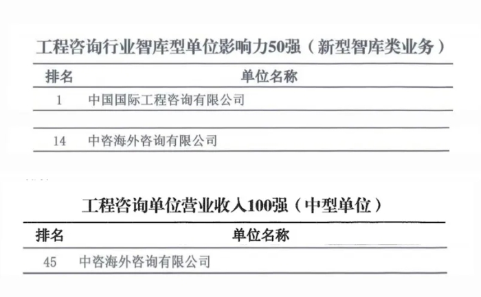 2024年11月,中國工程咨詢協(xié)會發(fā)布2023年度工程咨詢單位排名,海外公司名列工程咨詢行業(yè)智庫型單位影響力50強第14名、工程咨詢單位營業(yè)收入100強(中型單位)第45名,品牌聲譽和口碑持續(xù)彰顯。