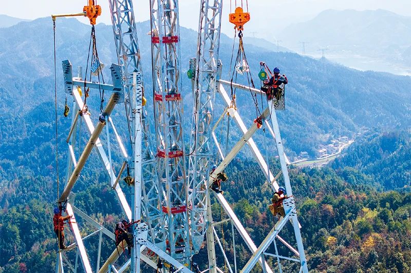 圖為2024年3月12日,電力工人在湖南省益陽市安化縣冷市鎮(zhèn)進(jìn)行組塔作業(yè)。 新華社記者 陳思汗/攝