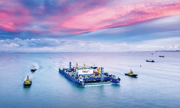 圖為2023年6月8日,“一航津安1”號(hào)沉管運(yùn)輸安裝一體船將E23管節(jié)和最終接頭浮運(yùn)至安裝現(xiàn)場(chǎng)。 新華社發(fā)