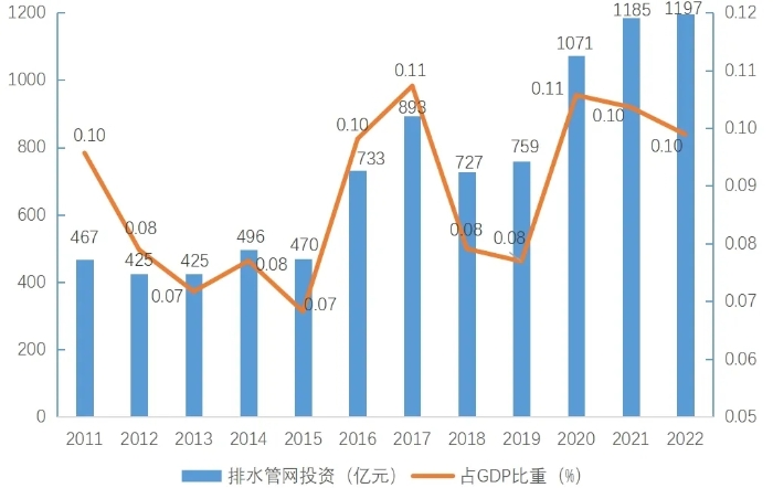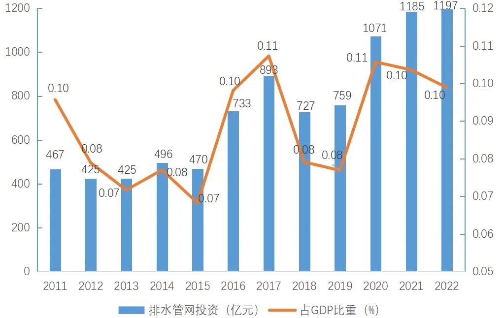 建設(shè)投資方面,我國排水管網(wǎng)投資總體上穩(wěn)中有升,但城市排水基礎(chǔ)設(shè)施的建設(shè)跟不上城市發(fā)展的步伐。在人均排水管道占有量、管網(wǎng)密度上,我國與發(fā)達(dá)國家相比仍有不小差距。根據(jù)《中國城市建設(shè)統(tǒng)計年鑒》的數(shù)據(jù)顯示,截至2022年底,我國已建成的城市排水管道總長度為91.35萬公里,同比增長4.73%;人均排水管網(wǎng)長度約1.94米(按城區(qū)人口計算),建成區(qū)排水管道密度為12.34公里/平方公里;城市生活污水集中收集率70.06%,比上年增加1.47個百分點(diǎn)。國外發(fā)達(dá)國家城市排水系統(tǒng)規(guī)劃建設(shè)較早,現(xiàn)已發(fā)展較為成熟。據(jù)資料記載,2002年,德國城市排水管道長度總計達(dá)到44.6萬公里,人均長度為5.44米,城市排水管網(wǎng)密度平均在10公里/平方公里以上,城市污水納管率平均高達(dá)93.2%;2002年,美國城市排水管道長度大約150萬公里,人均長度為4米以上,城市排水管網(wǎng)密度平均在15公里/平方公里以上;2004年,日本城市排水管道長度已達(dá)到35萬公里,排水管網(wǎng)密度一般在20~30公里/平方公里,高的地區(qū)可達(dá)50公里/平方公里。
