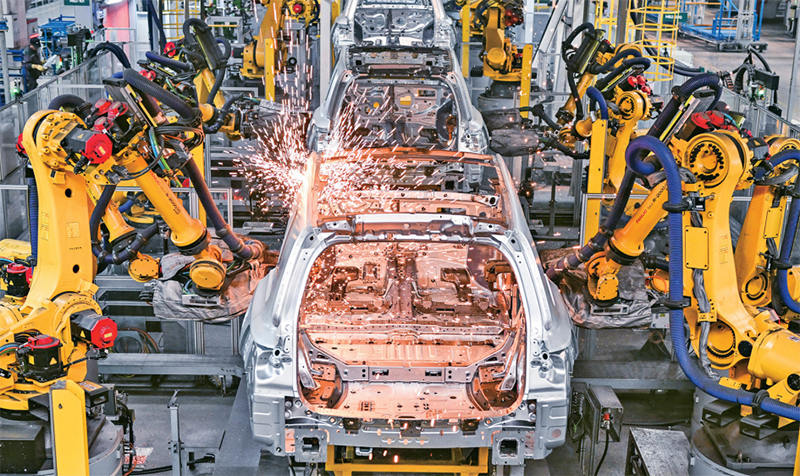 加快發(fā)展新質(zhì)生產(chǎn)力,要推動數(shù)字技術(shù)在先進制造業(yè)中的應(yīng)用擴散,形成兩者之間相互支撐、相互促進的良性循環(huán)。圖為2024年1月10日,在理想汽車常州基地車間,機械手臂在進行焊接作業(yè)。 新華社記者 季春鵬/攝