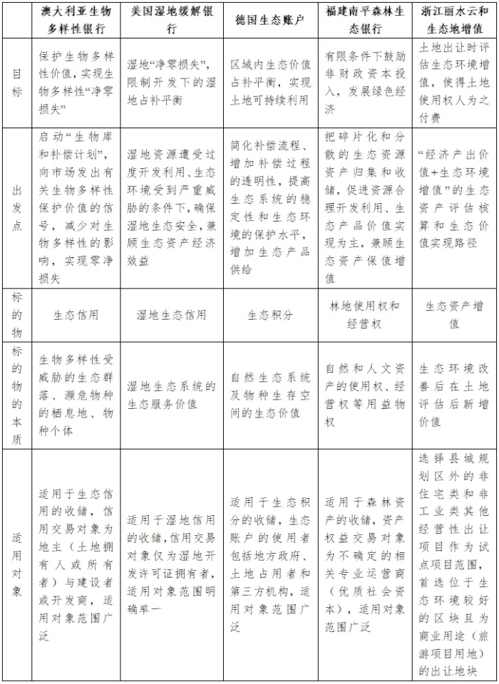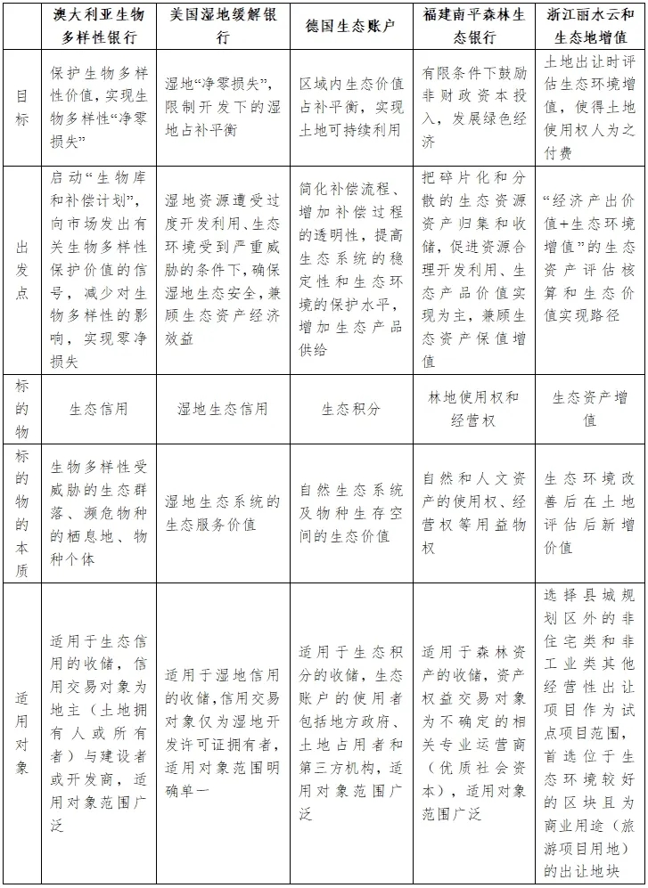總之,國內(nèi)外針對生態(tài)券制度目前并沒有明確的定義,實(shí)踐中各國各地都是基于自身情況設(shè)計(jì)了具體的制度形式和內(nèi)容。我們認(rèn)為目前最能反映生態(tài)券價(jià)值的是澳大利亞的生物多樣性銀行、美國的濕地銀行以及德國的生態(tài)賬戶。盡管在政策目標(biāo)、出發(fā)點(diǎn)、交易標(biāo)的物等方面存在不同(見表1),它們的共同點(diǎn)是均為由政府搭建的專門對產(chǎn)權(quán)清晰的自然資源生態(tài)權(quán)屬進(jìn)行交易的平臺,主要使命是對經(jīng)濟(jì)建設(shè)和開發(fā)活動(dòng)造成的對生態(tài)系統(tǒng)或生物多樣性的負(fù)面影響進(jìn)行修復(fù)或者補(bǔ)償,促進(jìn)“生物多樣性中和”或者“生態(tài)中和”,最終實(shí)現(xiàn)“自然資本增值”或“生物多樣性凈增益”。需要指出的是,生態(tài)券制度得以運(yùn)行的基礎(chǔ)是法制上對生態(tài)保護(hù)凈零損失或者生物多樣性中和的強(qiáng)制性要求;生態(tài)資源資產(chǎn)化得以可持續(xù)的還是需要形成規(guī)?;纳鷳B(tài)產(chǎn)業(yè),其基礎(chǔ)在于生態(tài)資源交易市場的構(gòu)建以及為保證交易配套的制度。